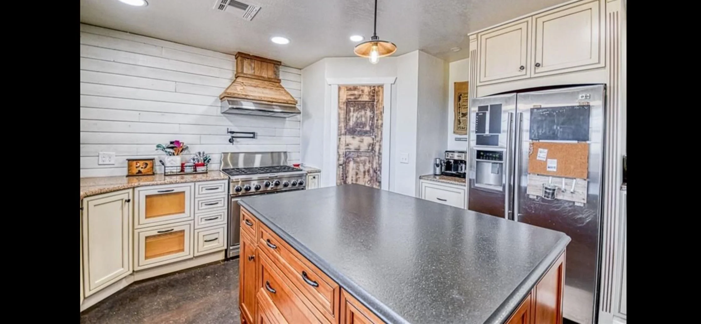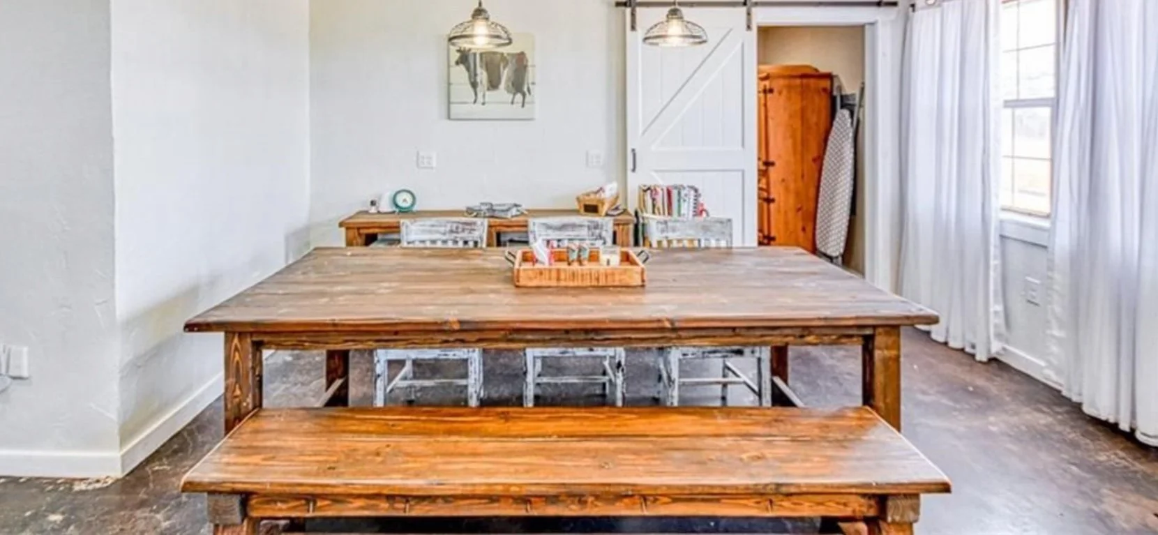 We stained and sealed the concrete floors making it a breeze to keep them clean, and it added a beautiful element to the rustic look incorporated into this farmhouse kitchen.
